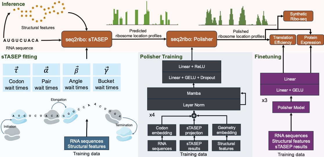 Motivation: Ribosome dynamics are vital in the process of protein expression. Current methods rely on ribosome profiling (Ribo-seq), RNA-seq profiles, and full genomic context. This restricts their use in de novo sequence design, like messenger RNA (mRNA) vaccines. Simulation-only approaches like the Totally Asymmetric Simple Exclusion Process (TASEP) oversimplify translation by focusing solely on codon elongation times.